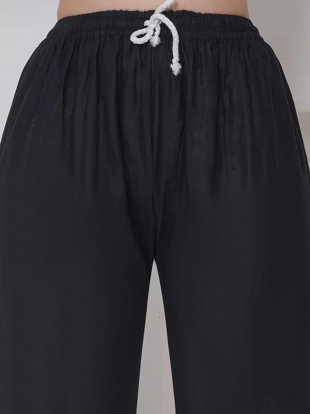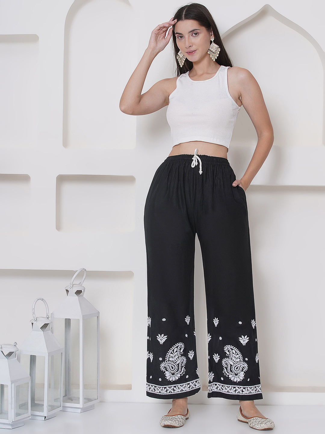 Upgrade your comfort and elegance with these Chikankari plazzo - the ultimate combination of practicality and beauty. Adorned with delicate hand-embroidered designs at the hem, these pants are the ideal choice for completing your traditional or contemporary outfit. Boasting a loose fit and elastic waistband, they offer both comfort and fashionable appeal. Team them with kurtis, tunics, or crop tops for a chic and refined appearance.