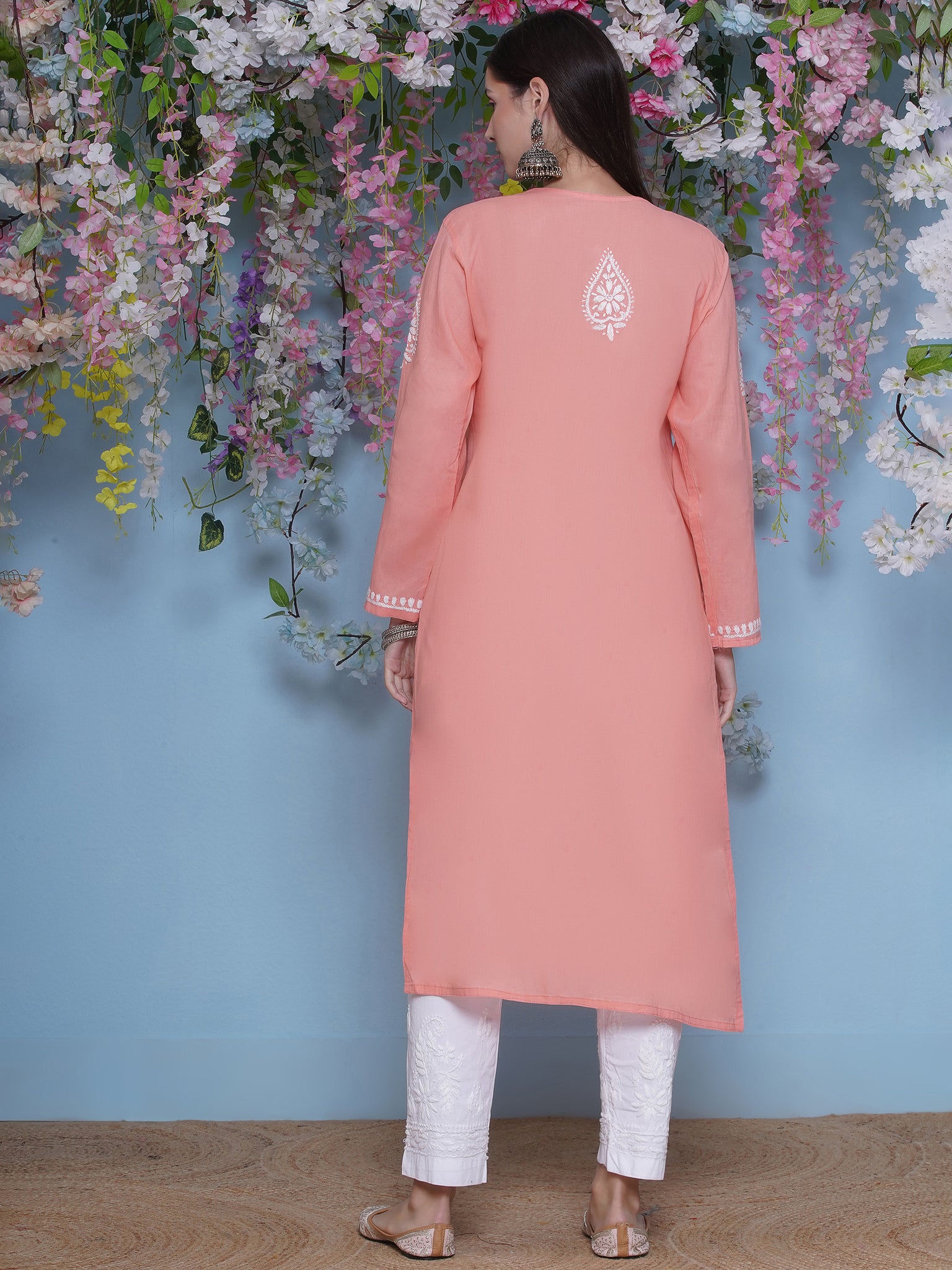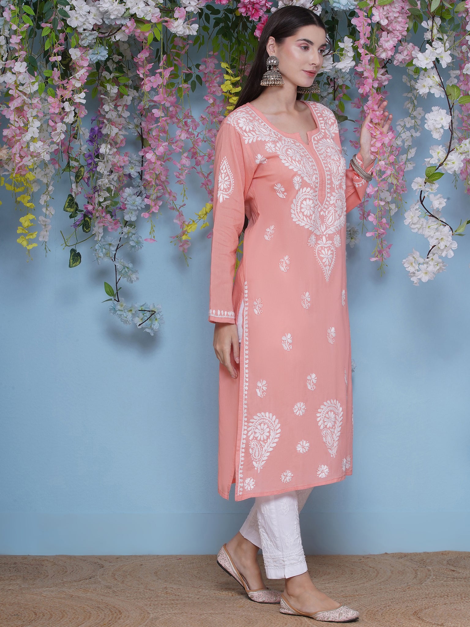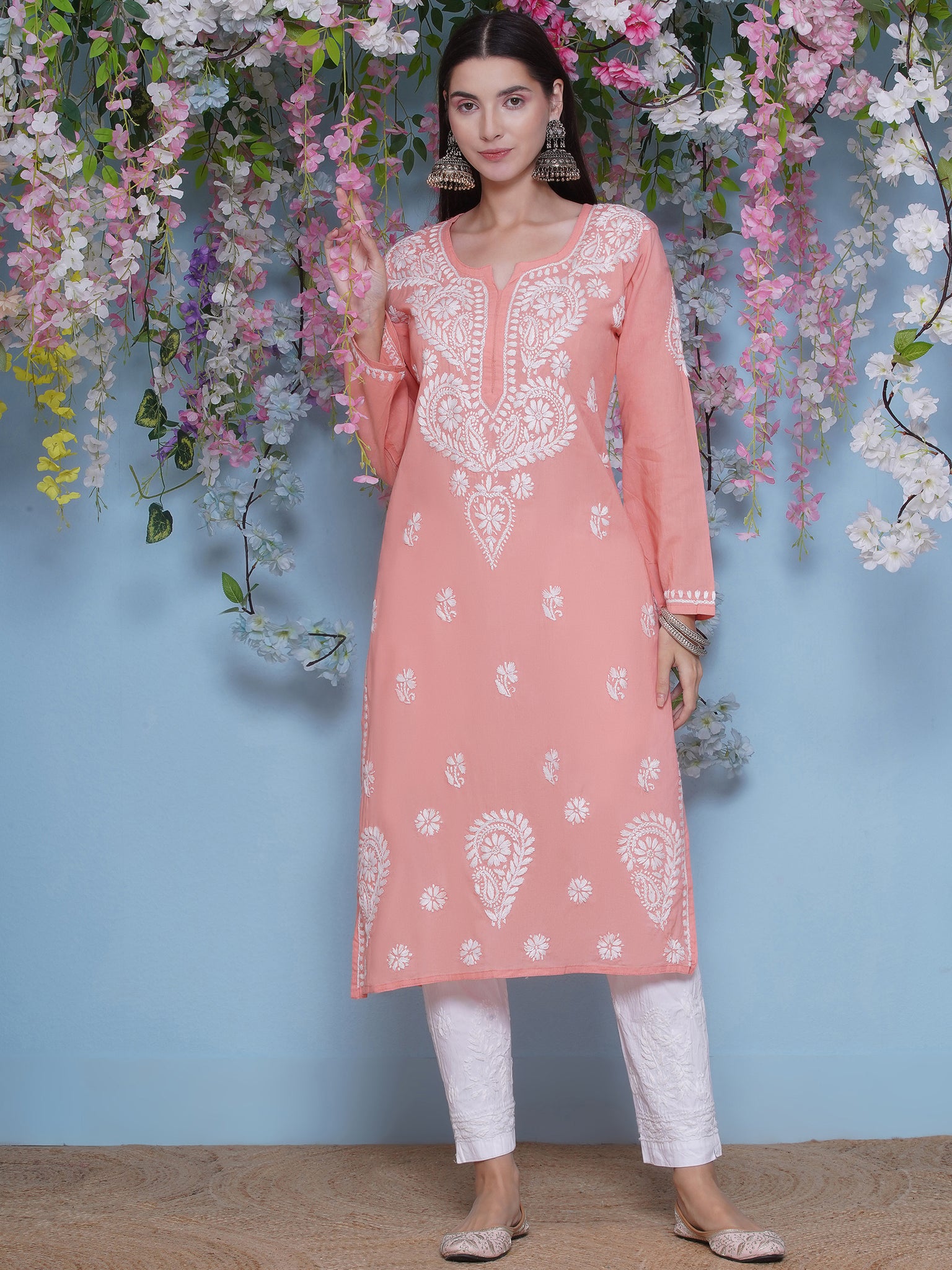 Peach Cotton Chikankari Kurti For Women – Saahiba
