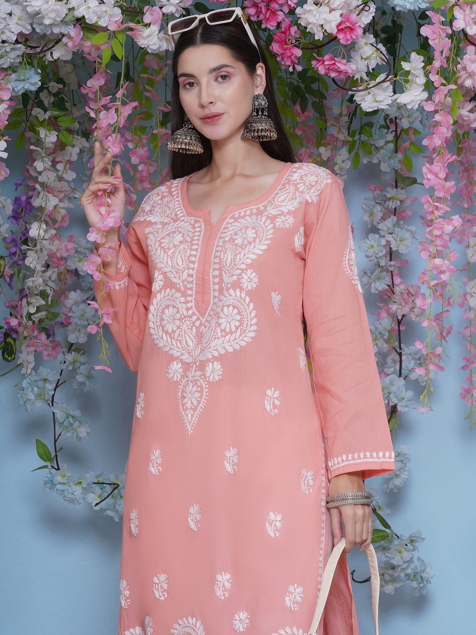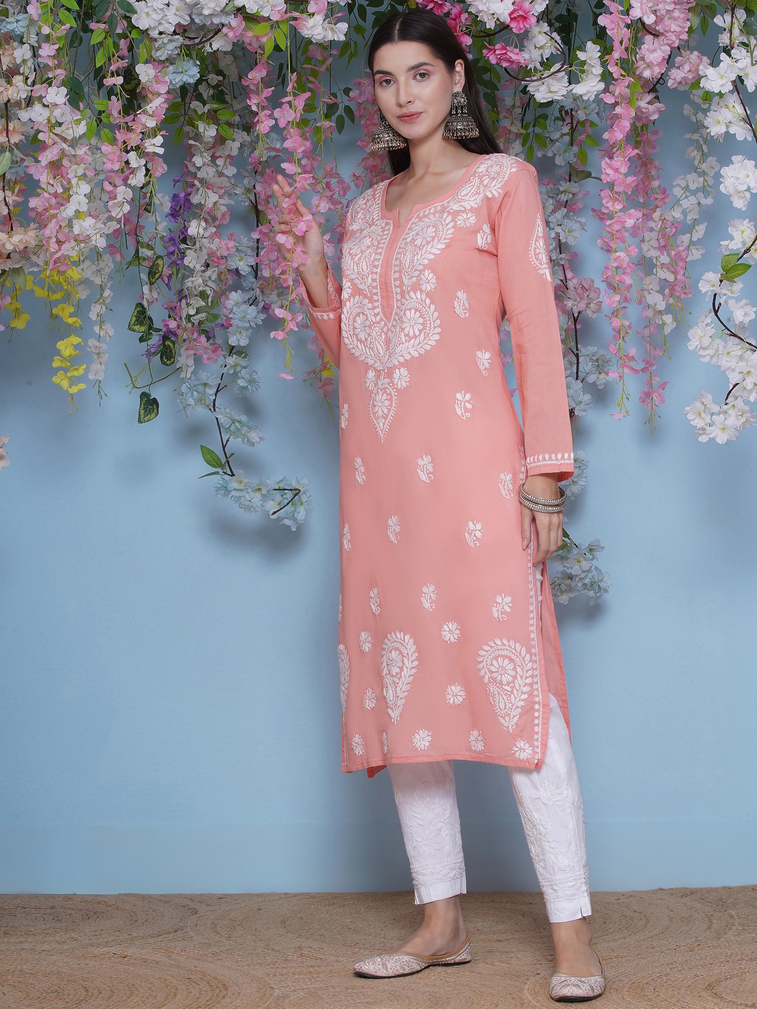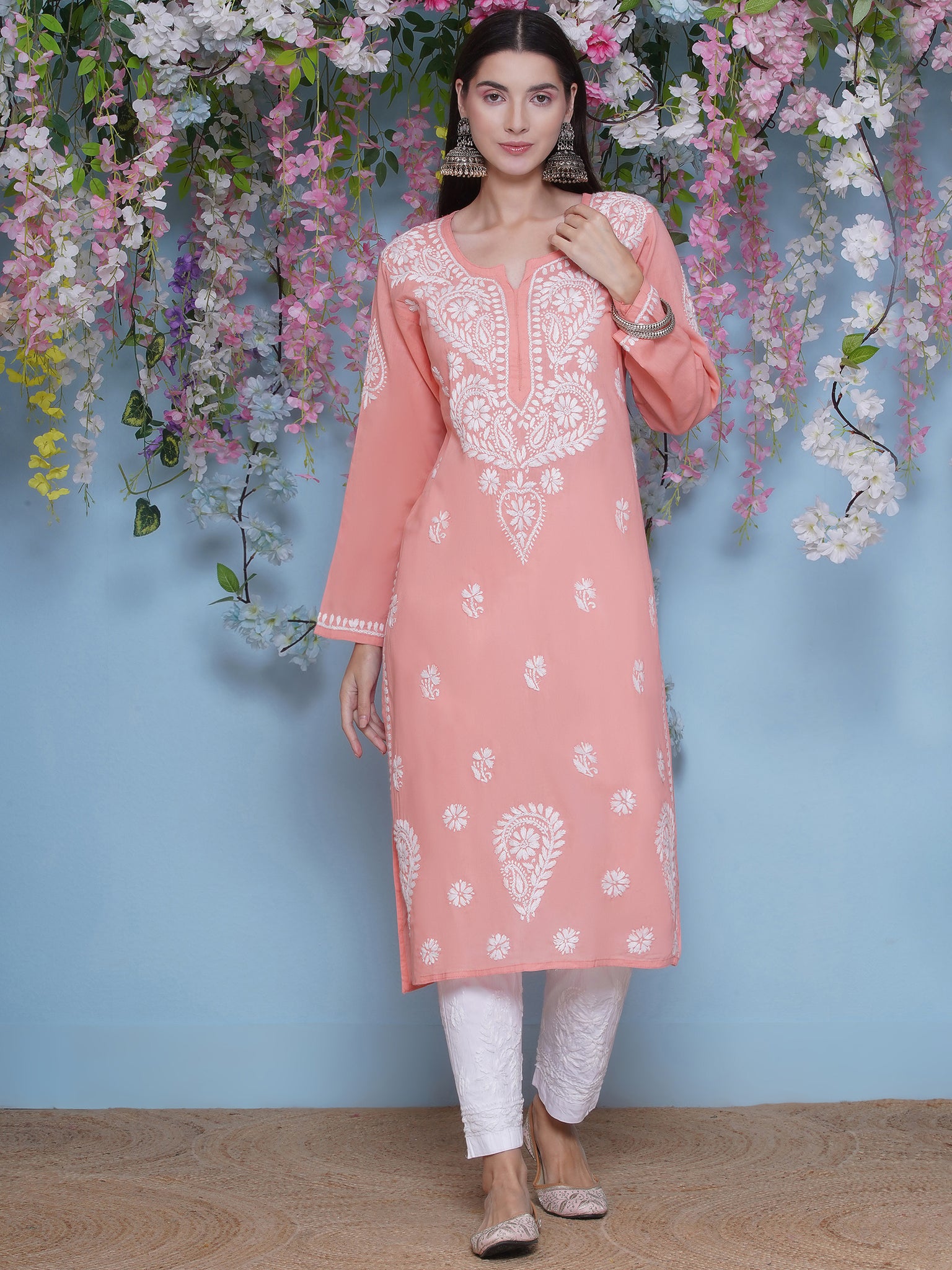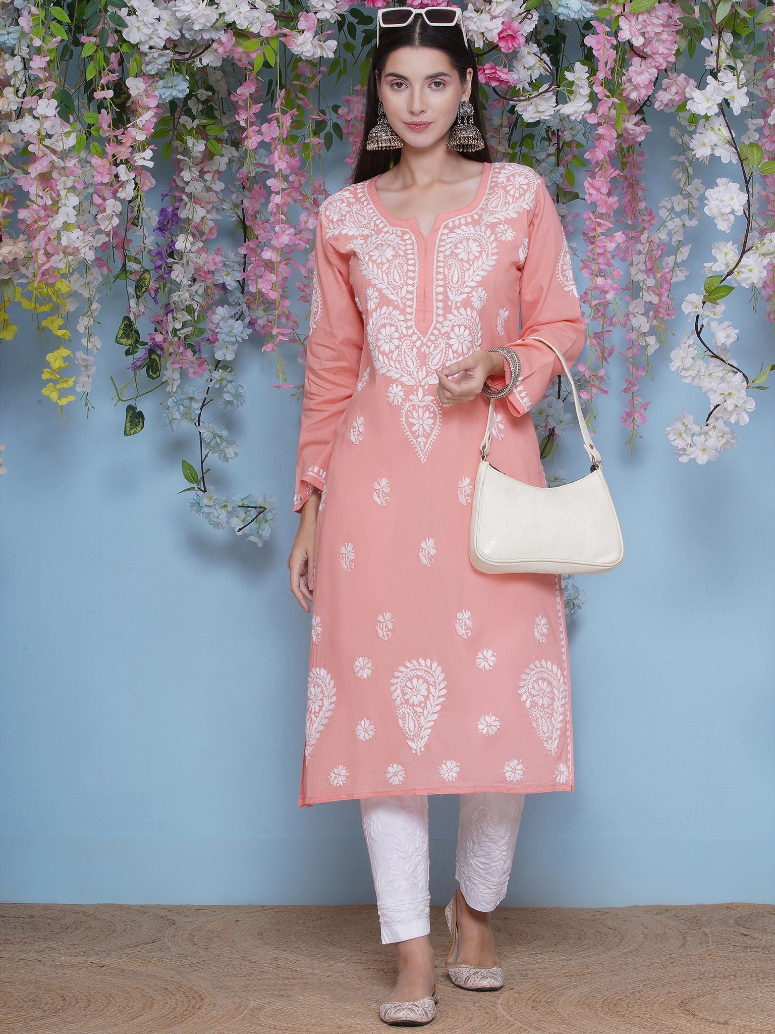 Peach Cotton Chikankari Kurti For Women – Saahiba